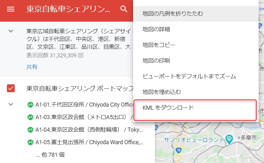地図を選び、チェックボックスにして「OK」を押すと、KMLファイルがダウンロードされます。