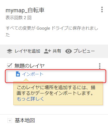 Googleマイマップのサイトへ行き、新しい地図を作成し、先ほどダウンロードしたKMLをインポートします。